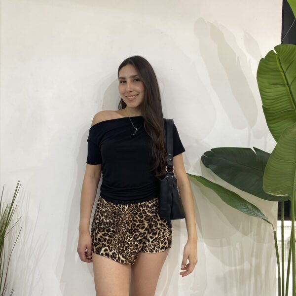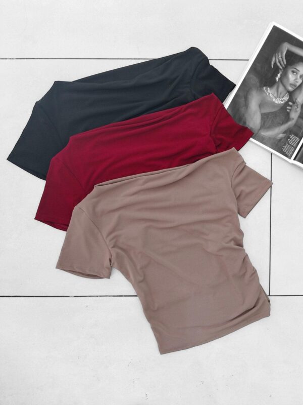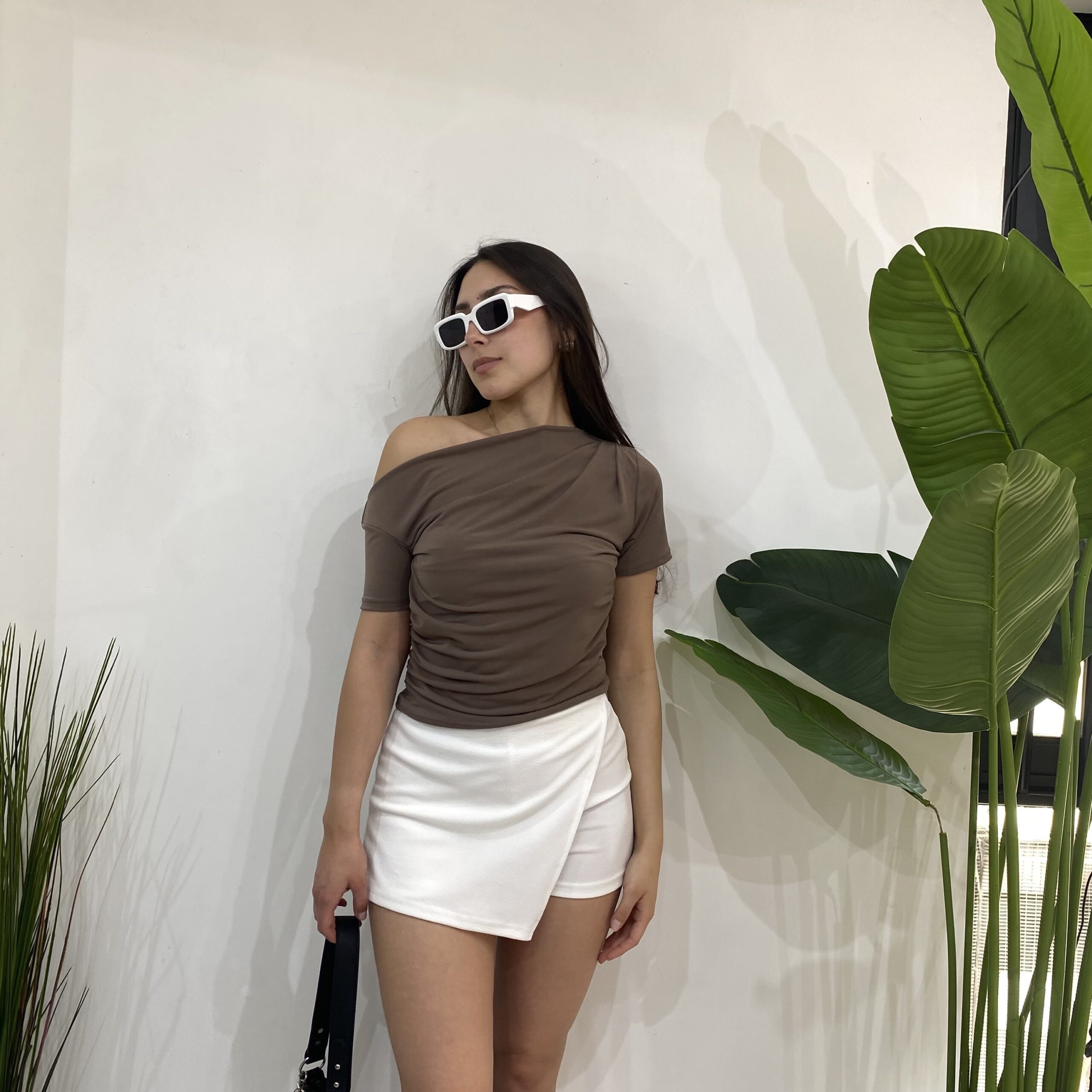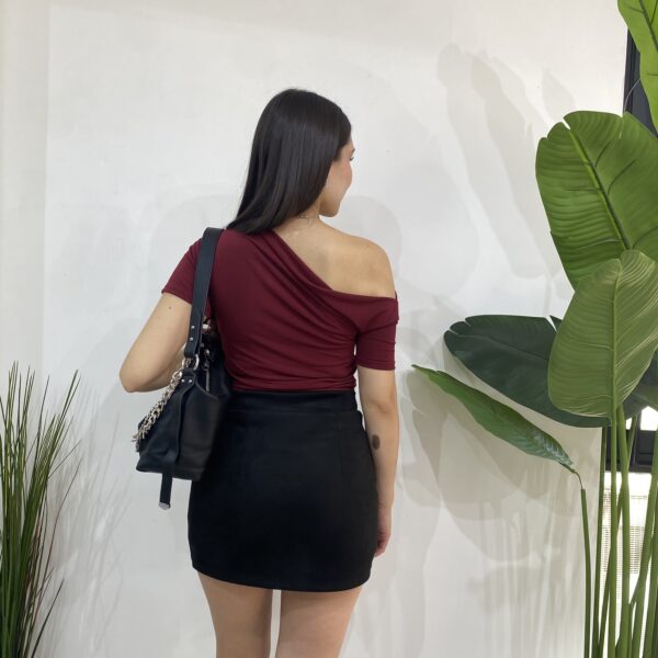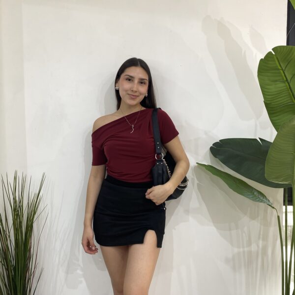 Elaborada en material lycra con un hombro caido, tiene pliegues para darle mas estilo, soble tela en la zona del busto y recogido en un lateral. Da 7 cm extra aprox✨