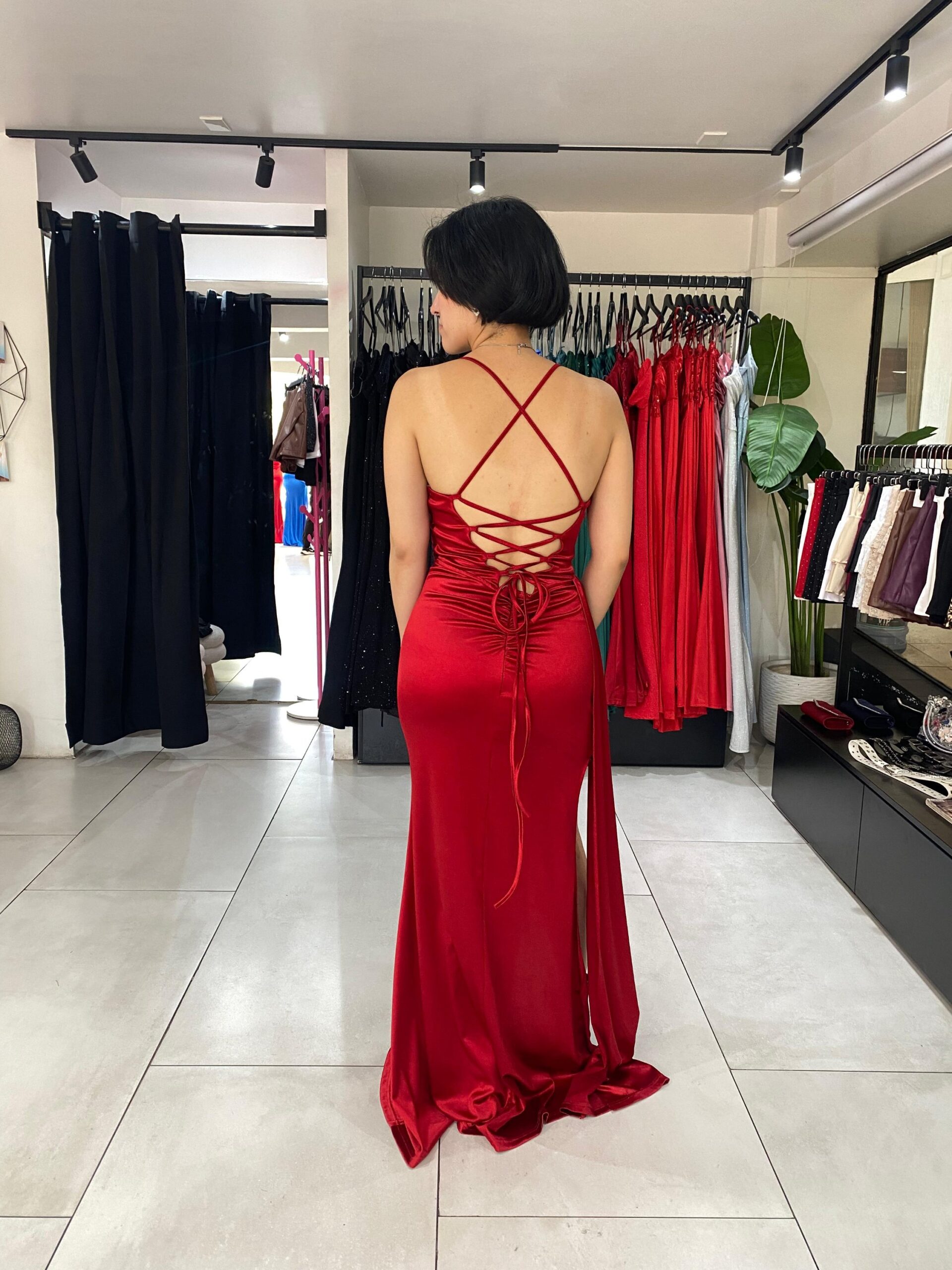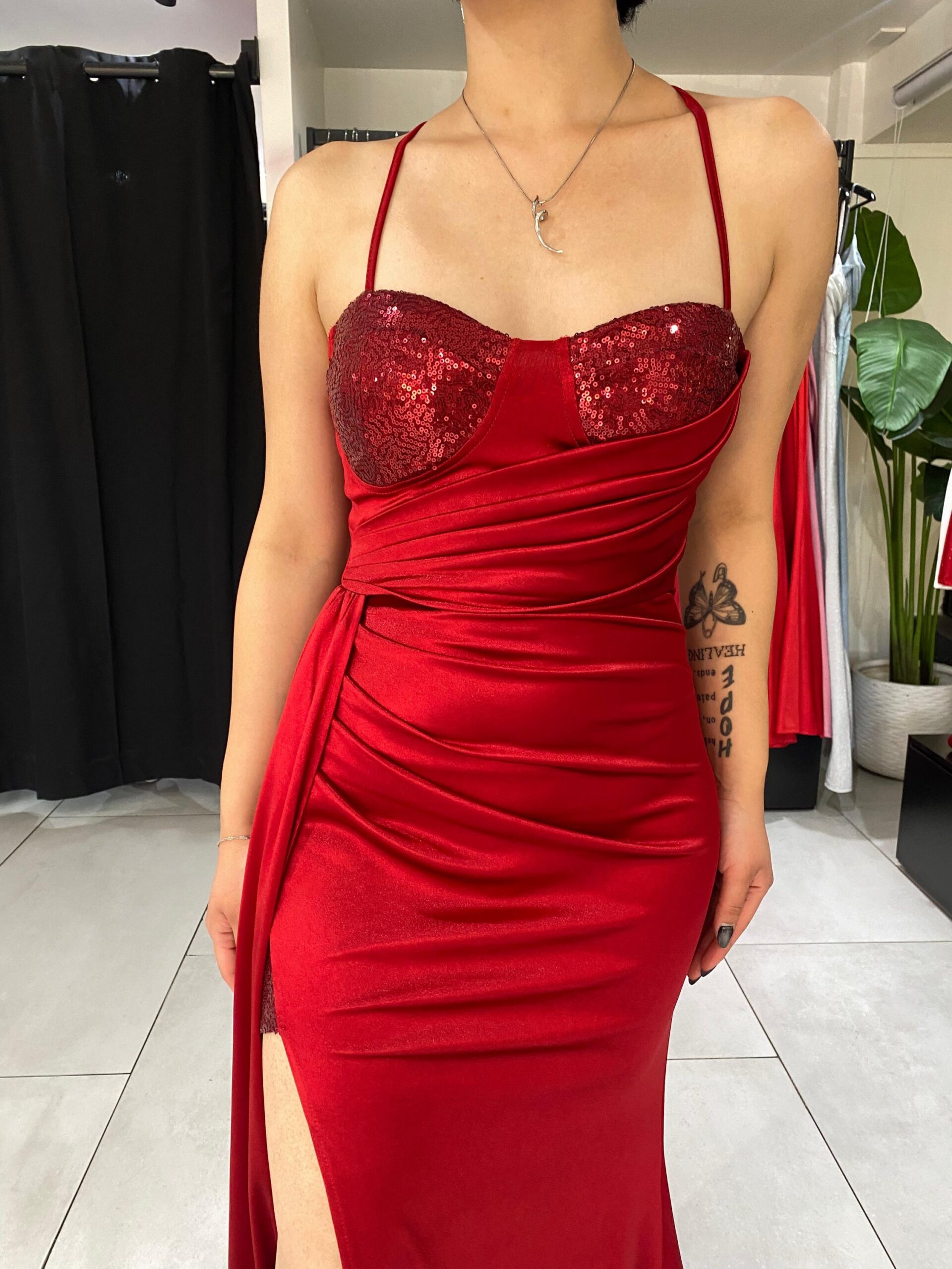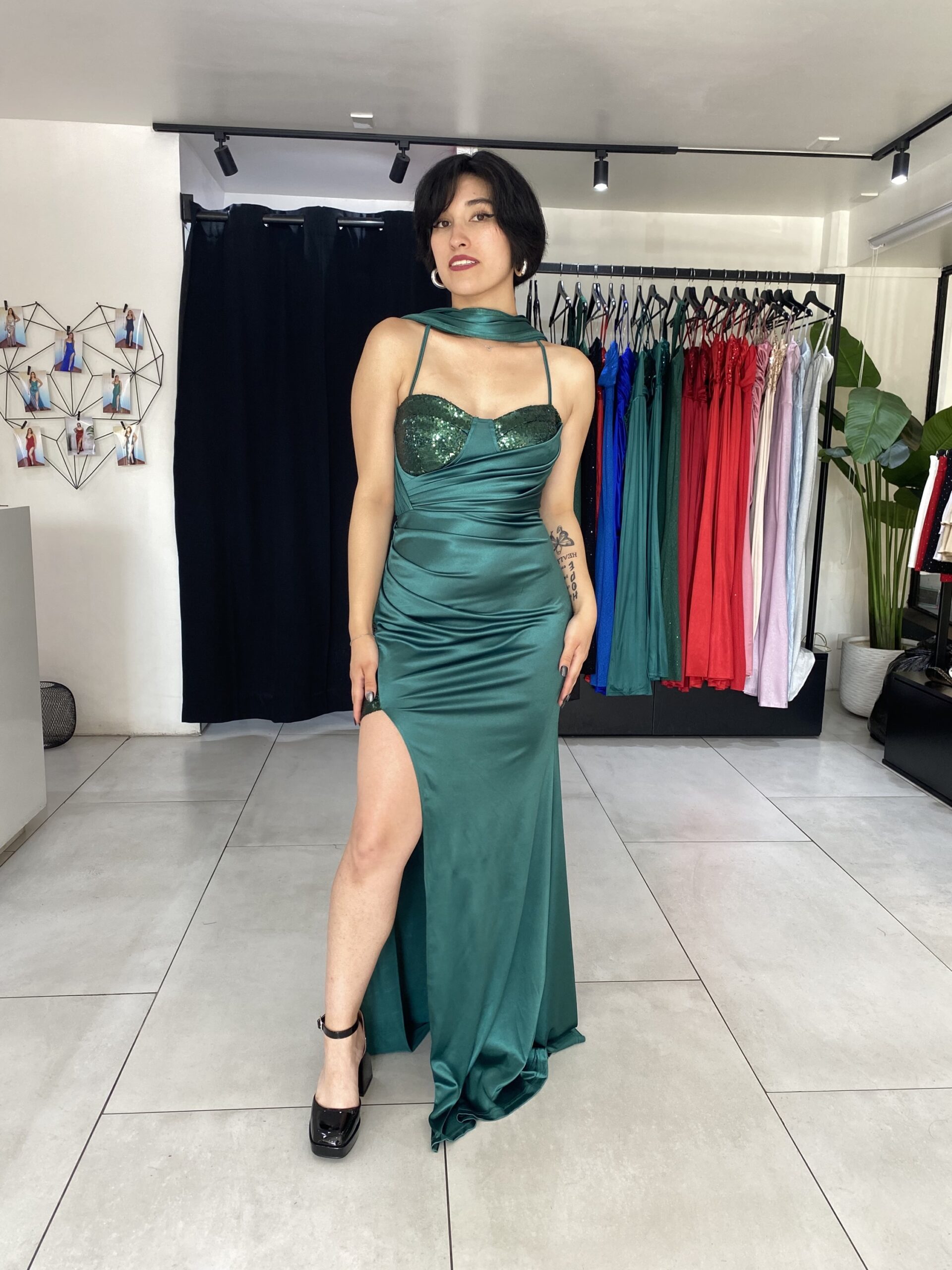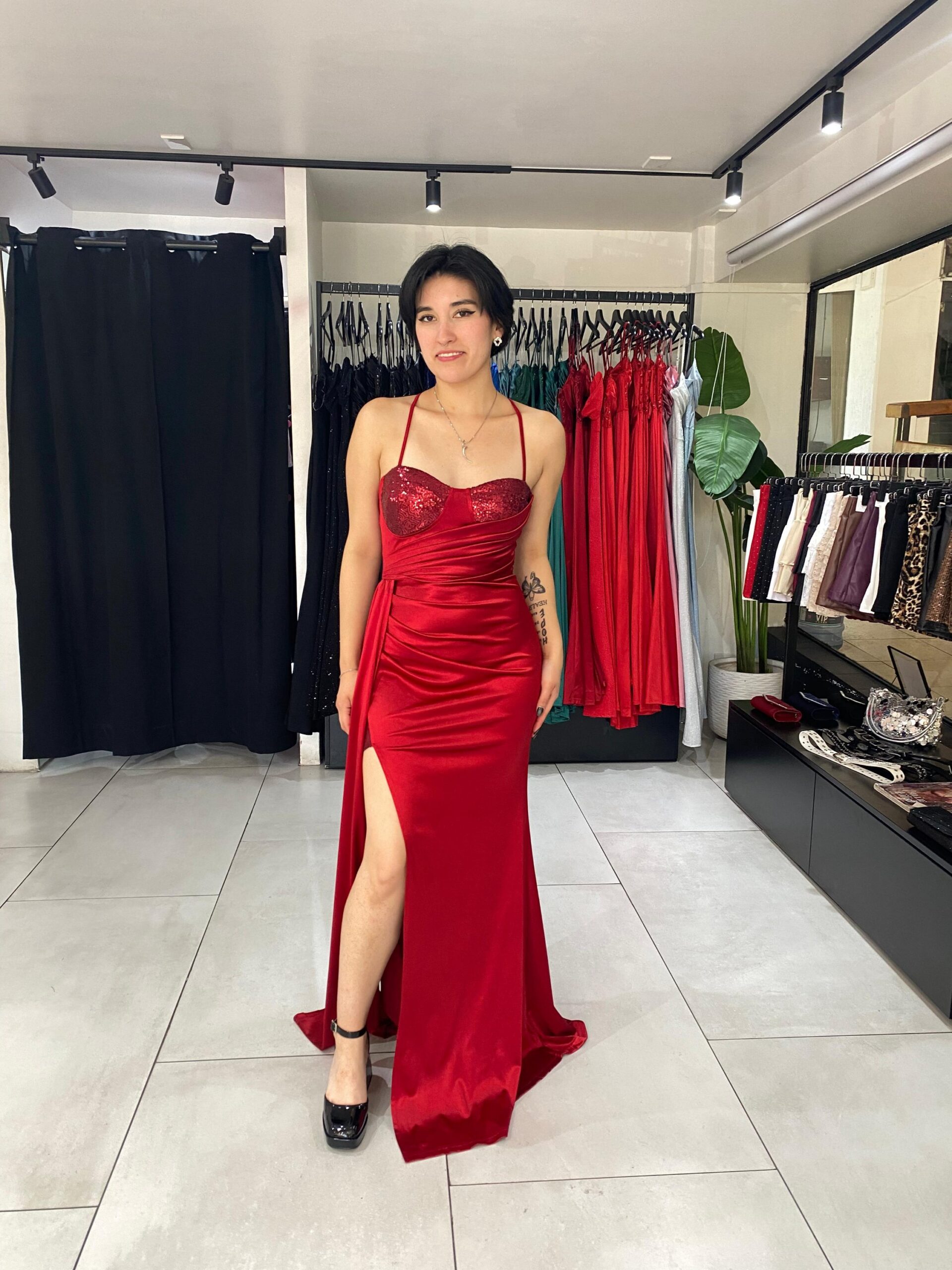 Vestido de gala elaborado en material satin elasticado estira 10 cm extra aprox. contiene copa para usar sin brasier y tirantes ajustables para que lo ajustes a tu medida en la parte frontal superior contiene estilo corset, lentejuelas y al costado tiene una tela caída para darle un toque más elegante al vestido ✨