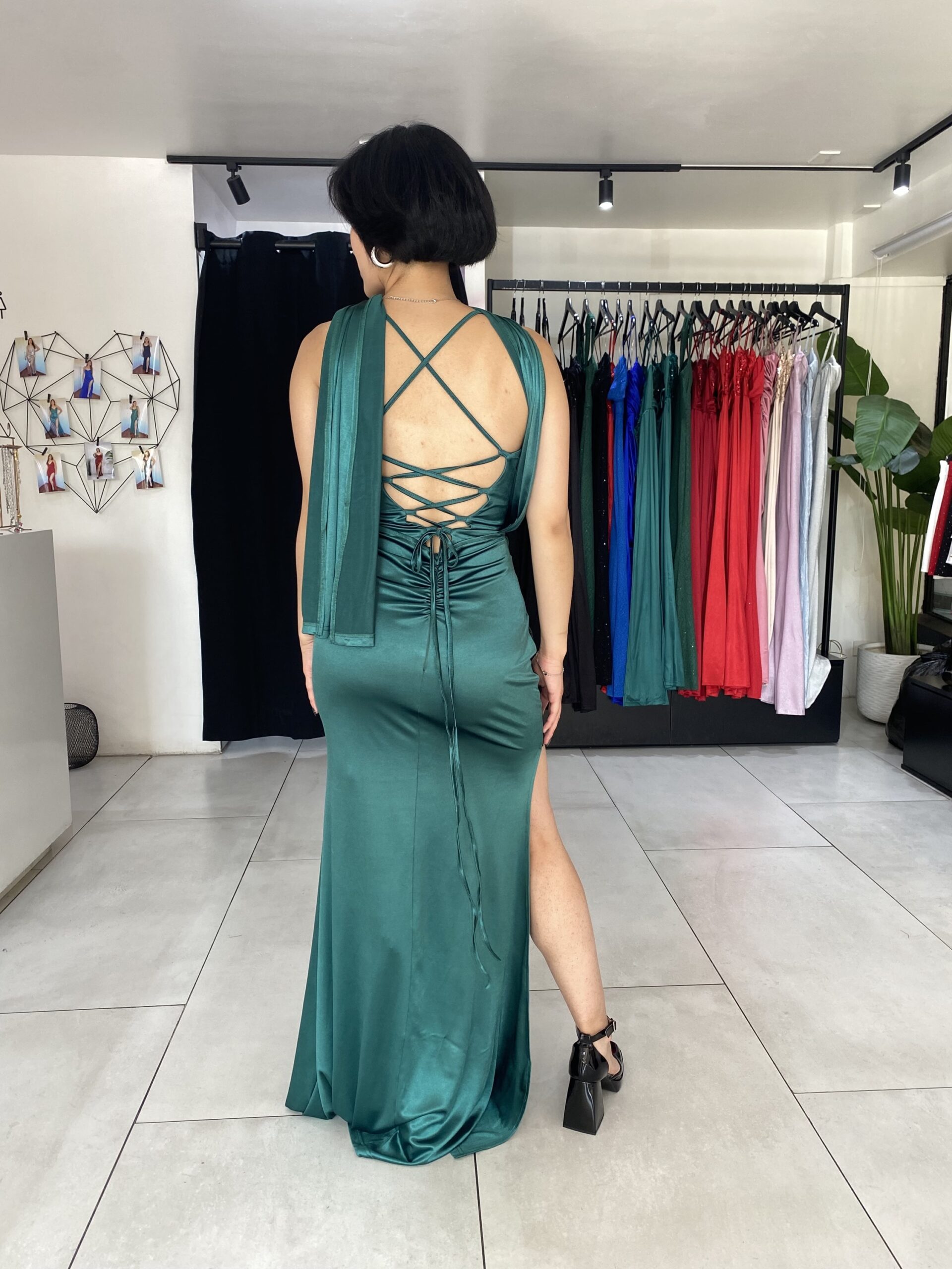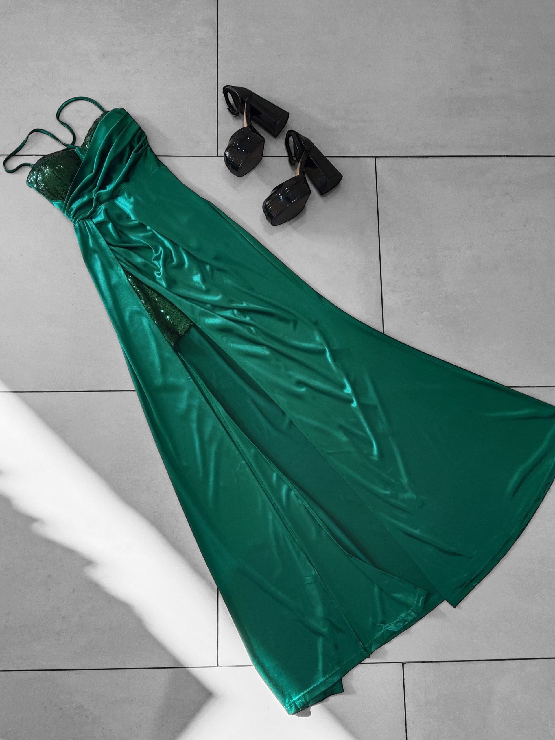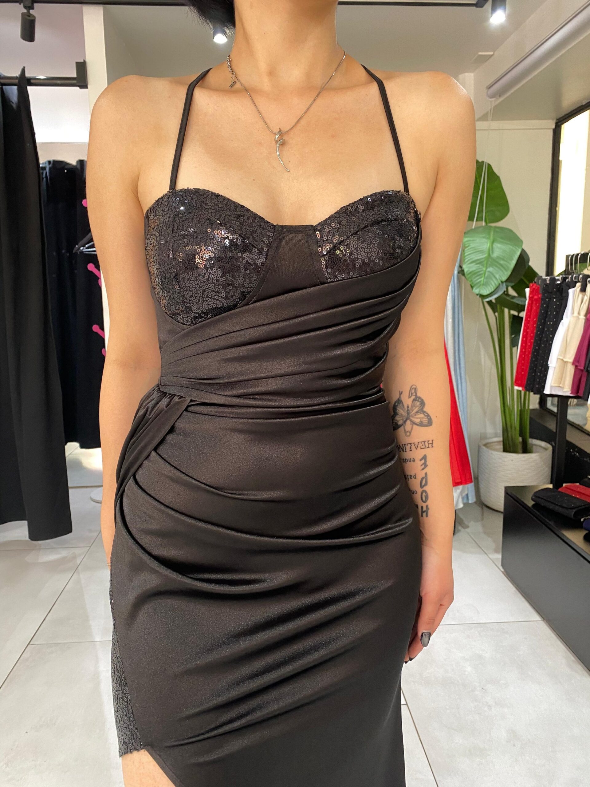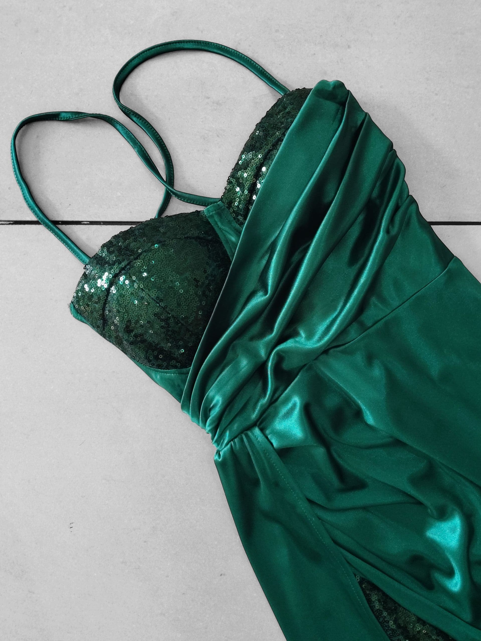 Vestido de gala elaborado en material satin elasticado estira 10 cm extra aprox. contiene copa para usar sin brasier y tirantes ajustables para que lo ajustes a tu medida en la parte frontal superior contiene estilo corset, lentejuelas y al costado tiene una tela caída para darle un toque más elegante al vestido ✨