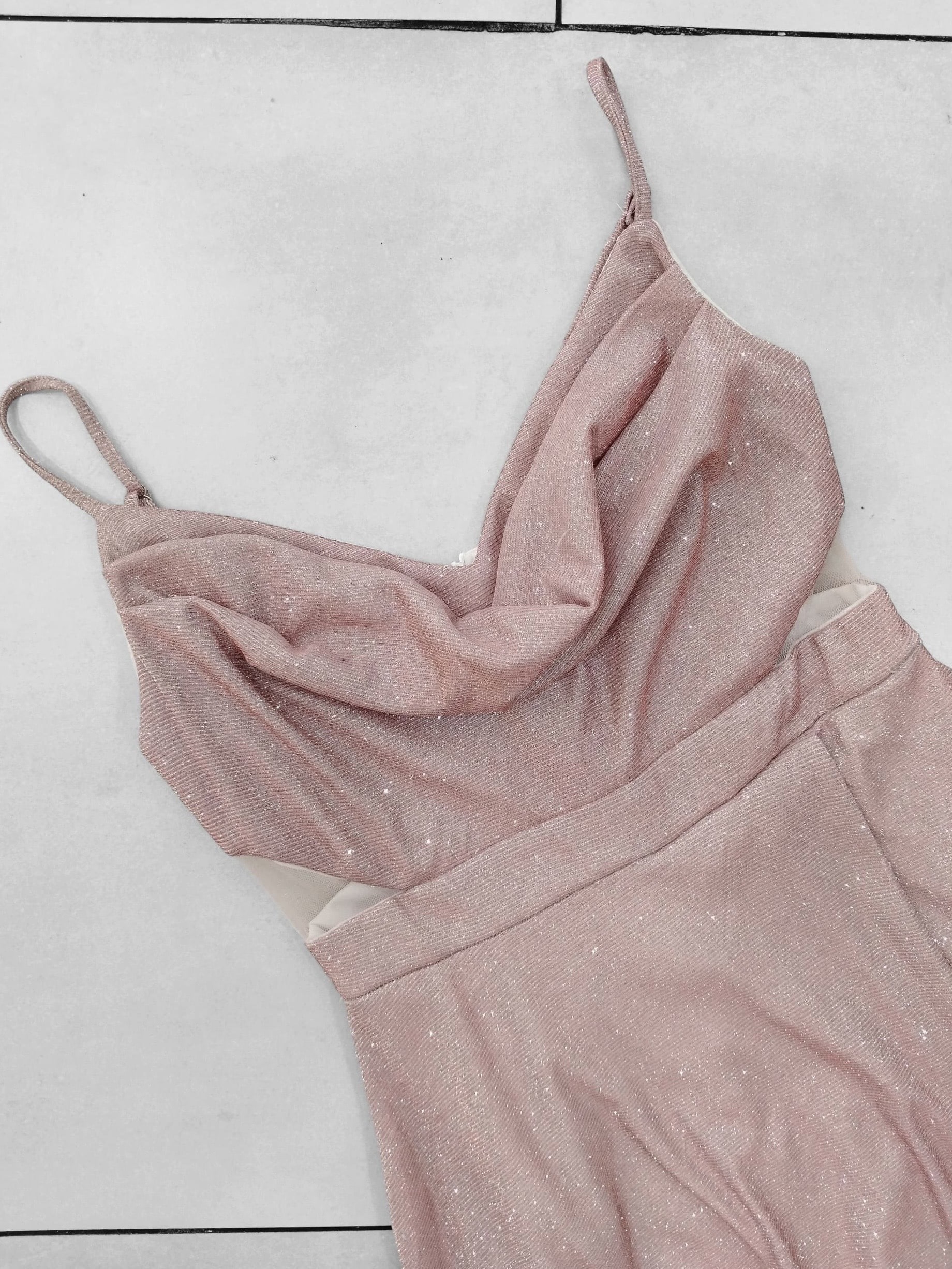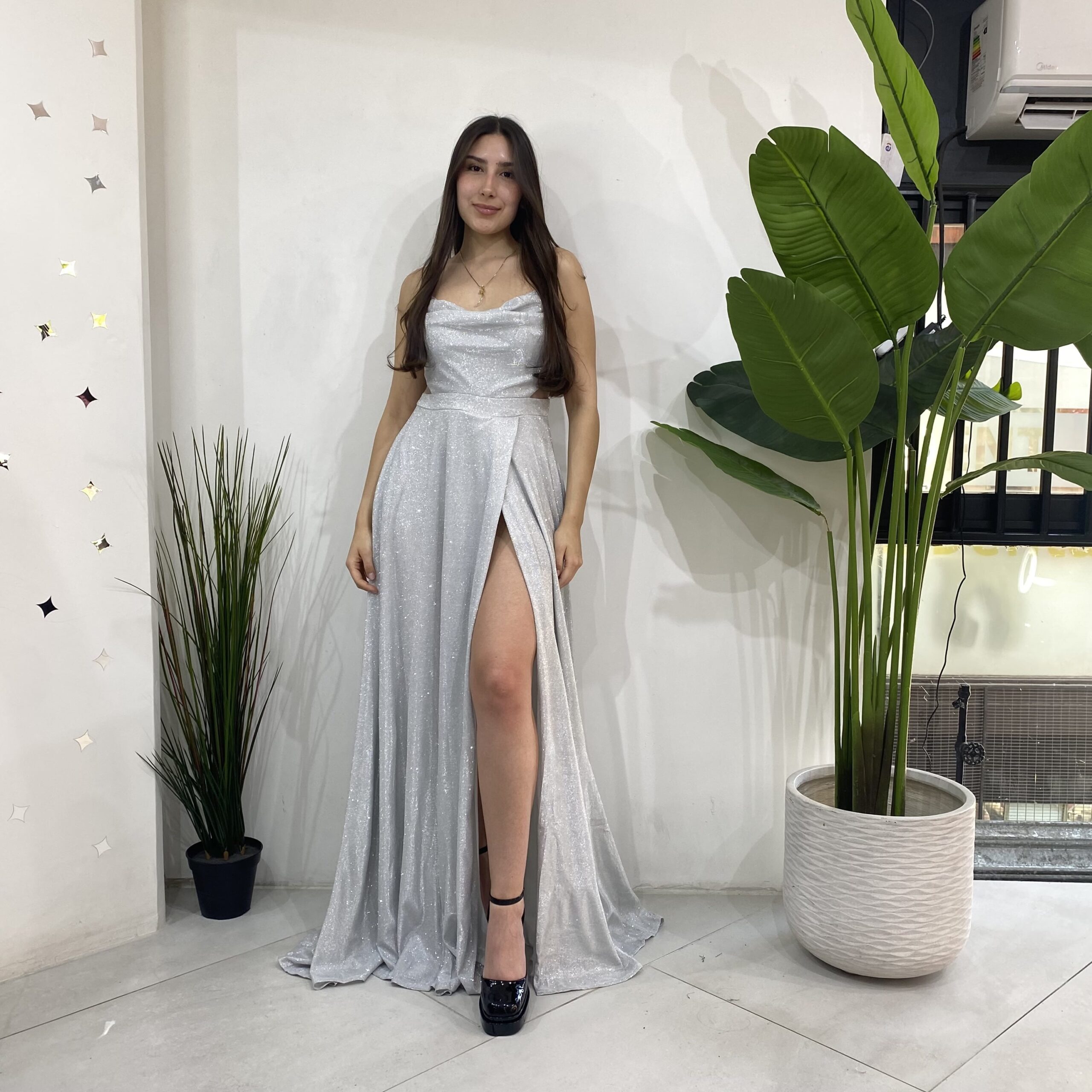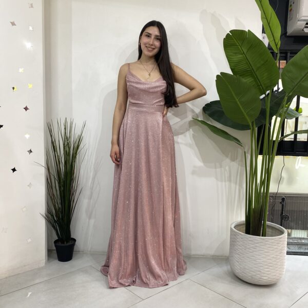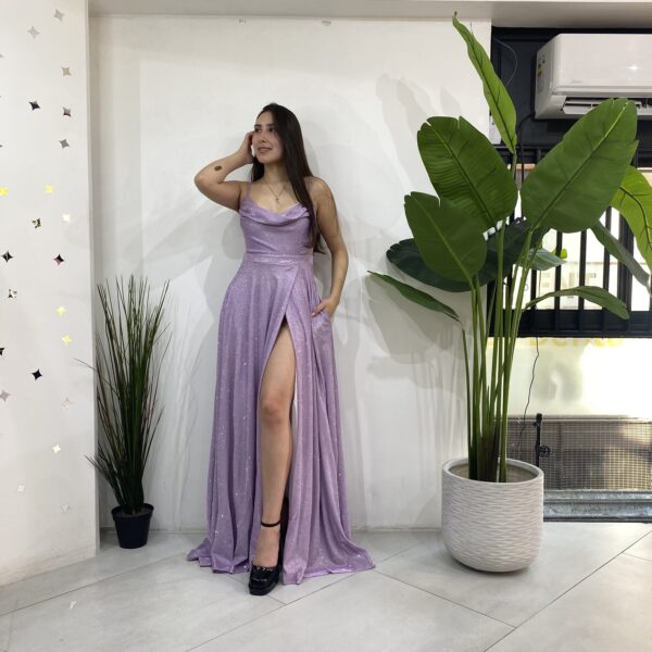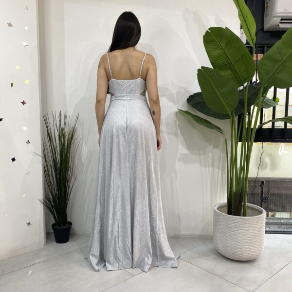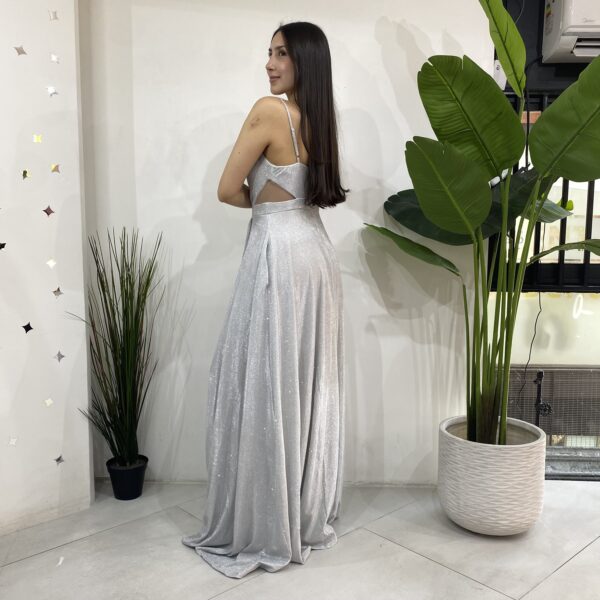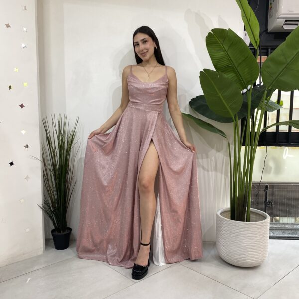 Elaborado en tela elasticada 10 centimetro extra con brillantina, escote en V con tela caída para darle un toque mas elegante al vestido. Contiene malla transparente en los costados a la altura de la cintura apegado a la superior y terminación estilo acampanado con una apertura en la pierna izquierda. Con bolsillos en las parte lateral y cierre en la parte y trasera mas tirantes ajustables.
