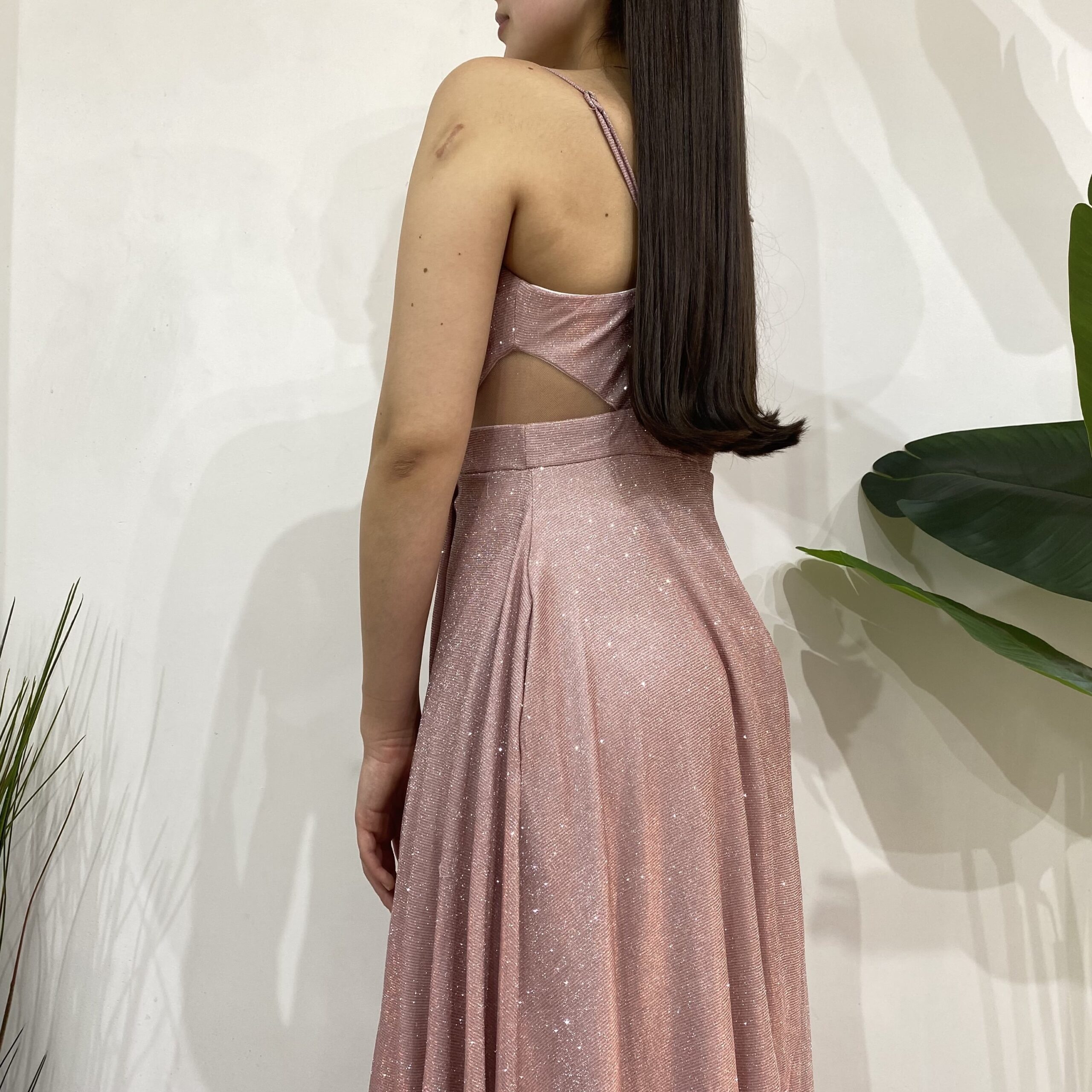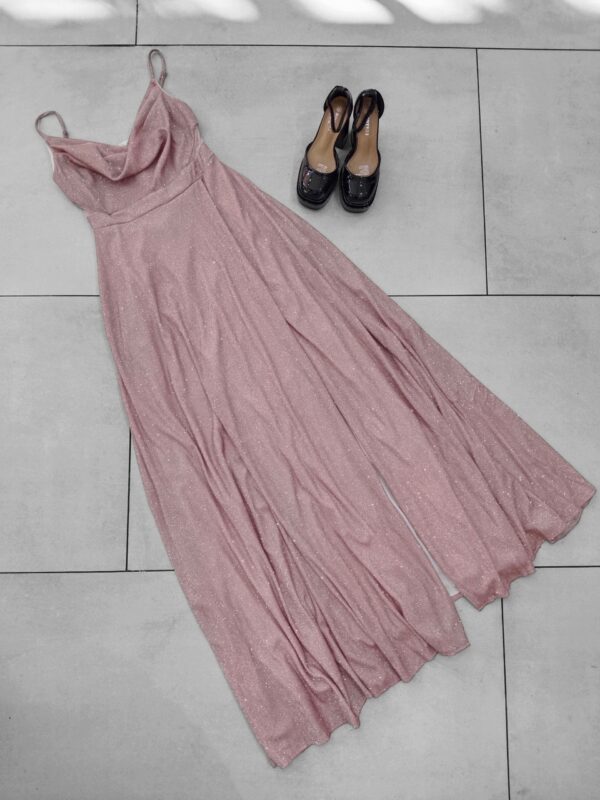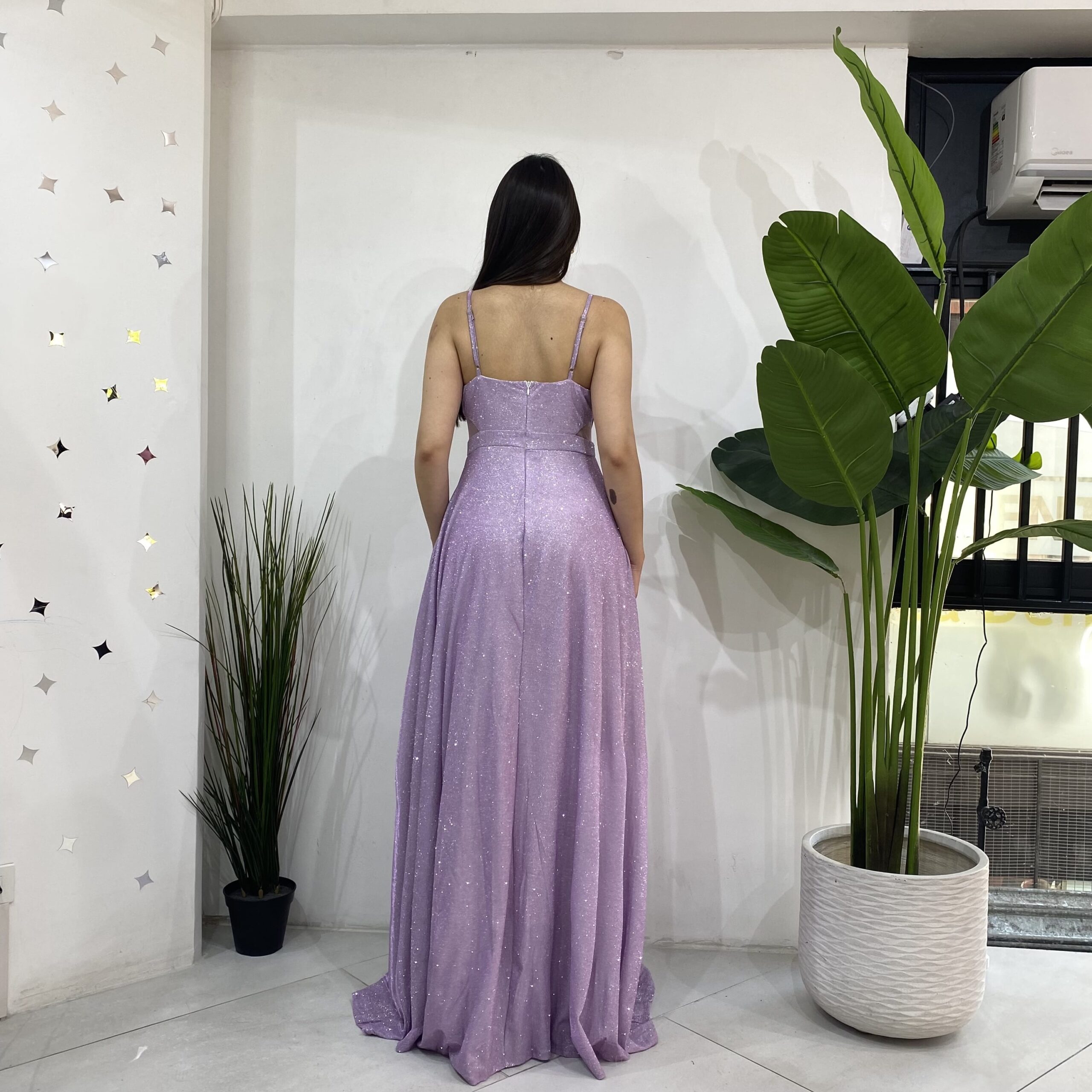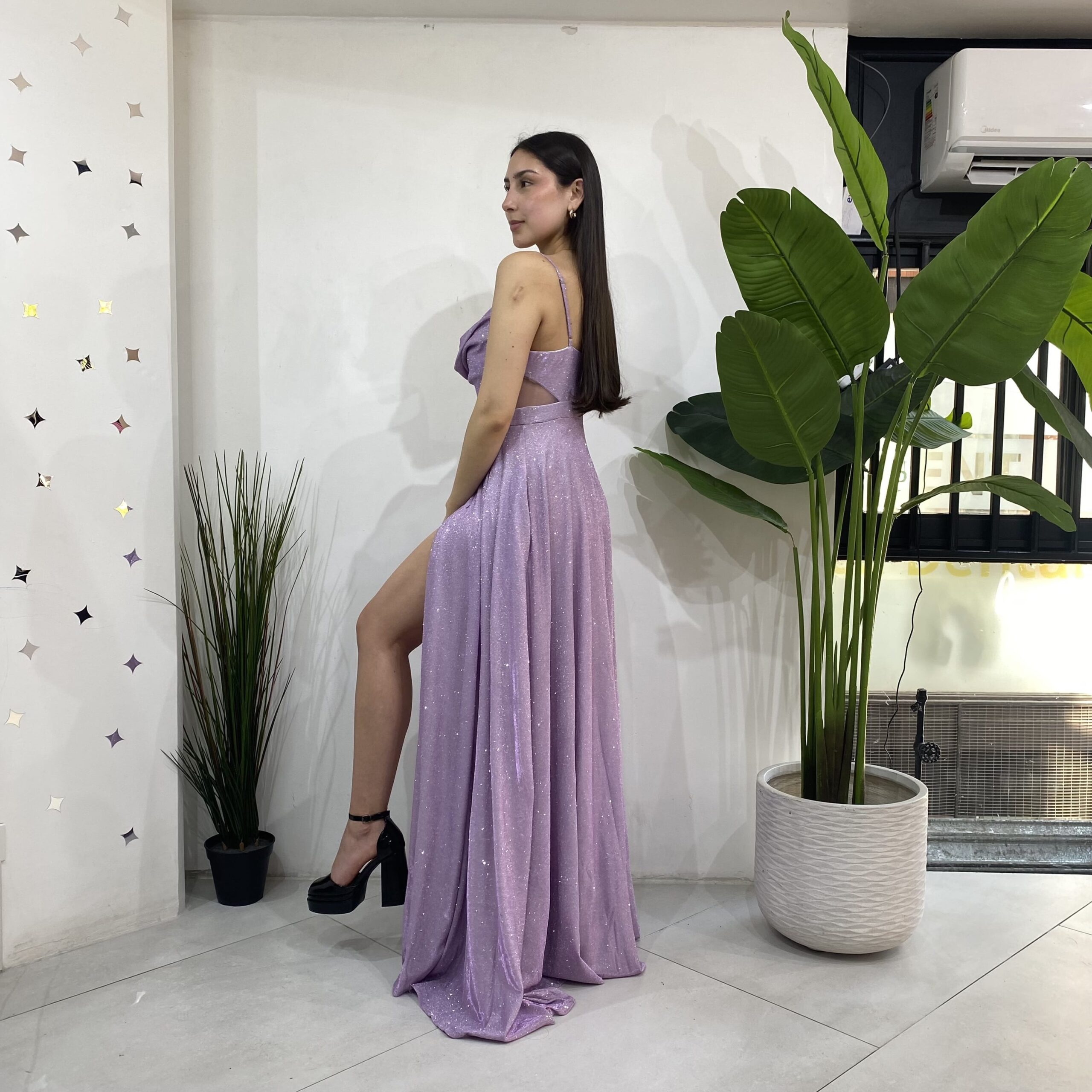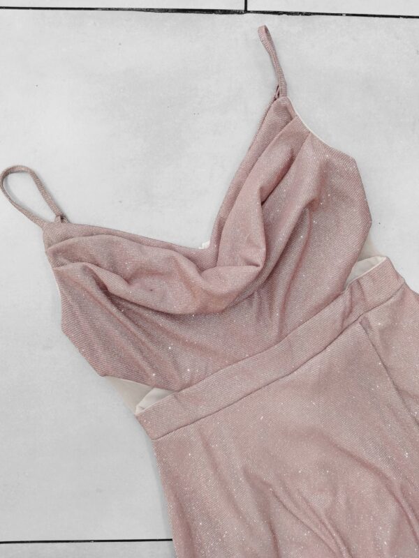 Elaborado en tela elasticada 10 centimetro extra con brillantina, escote en V con tela caída para darle un toque mas elegante al vestido. Contiene malla transparente en los costados a la altura de la cintura apegado a la superior y terminación estilo acampanado con una apertura en la pierna izquierda. Con bolsillos en las parte lateral y cierre en la parte y trasera mas tirantes ajustables.