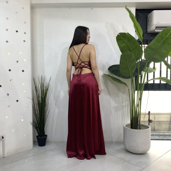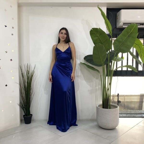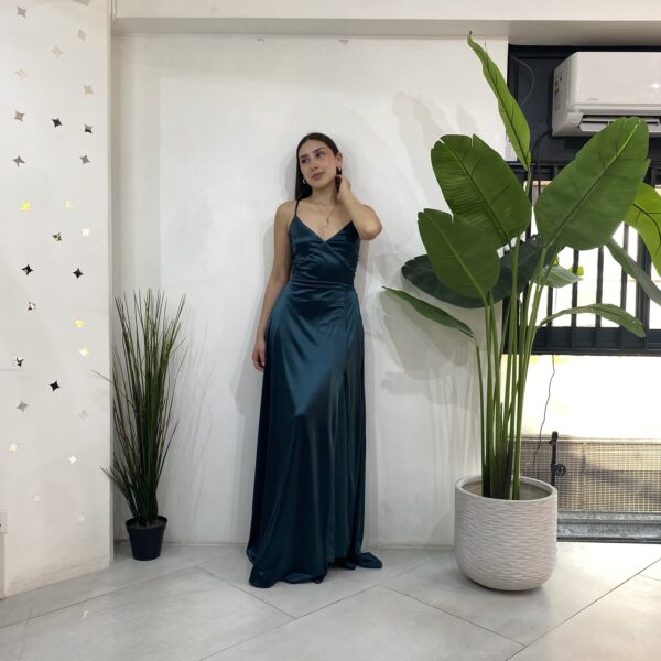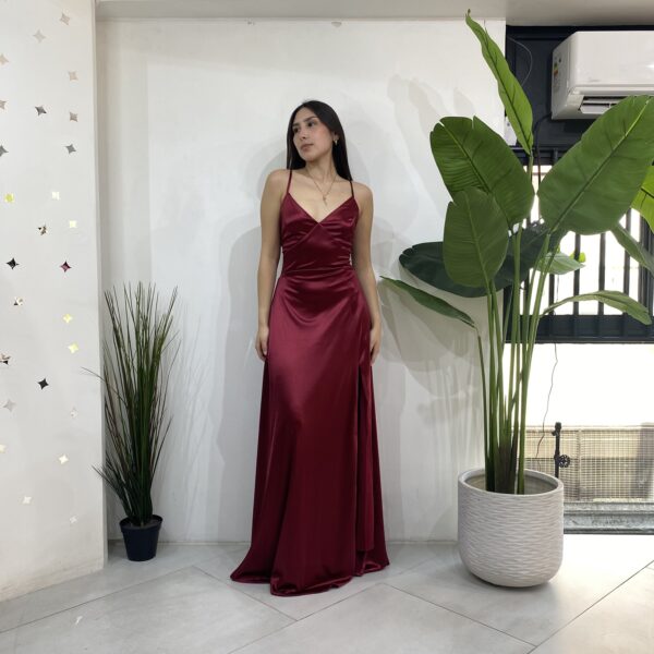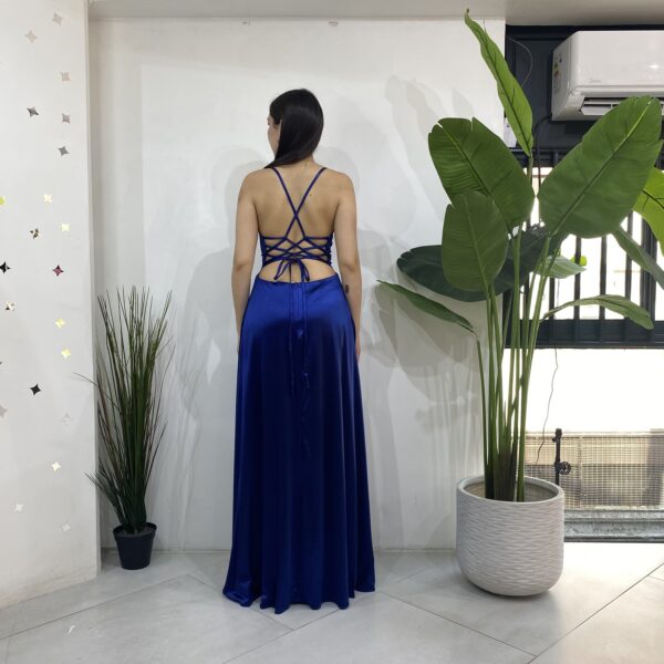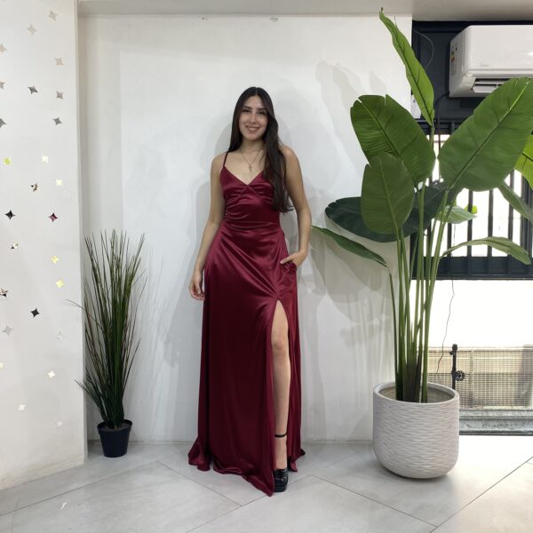 Elaborado en tela elasticada 10 centimetro extra de satin, escote en V para darle un toque mas elegante al vestido. Terminación estilo acampanado con una apertura en la pierna izquierda. Con bolsillos en las partes laterales y cierre en la parte trasera. Espalda abierta y tirantes cruzado ajustables.